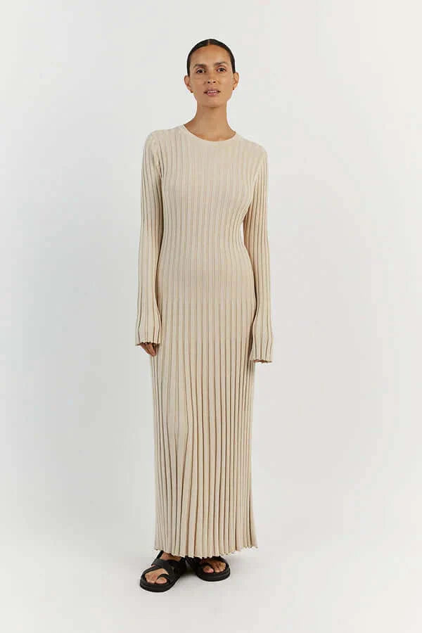 Introducing the Crew Neck Sleeved Knit Midi Dress by Aerelle.